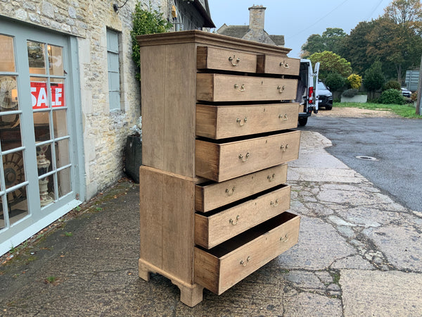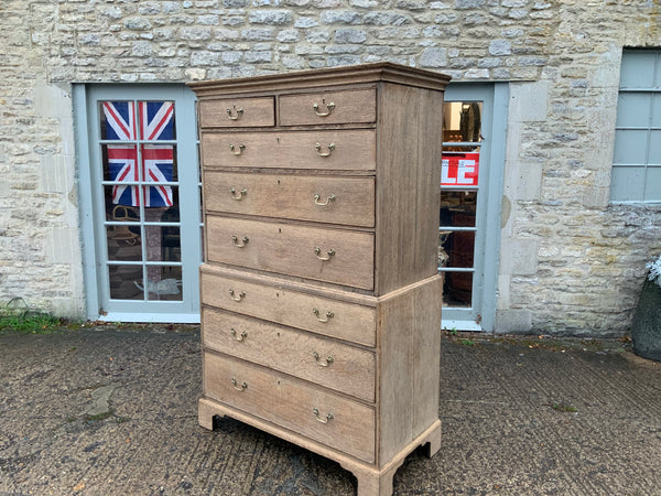 Good quality country house oak chest on chest which has been stripped and bleached. Raised on original bracket feet with original handles. The chest comes in two parts for ease of transport.