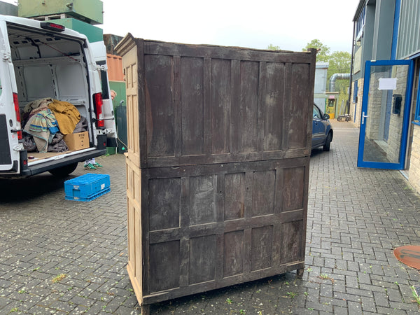 Large Mid 18th Century oak housekeepers cupboard. The cupboard has been stripped and bleached to reveal the lighter colour. It comes in two parts for ease of transport. The top has three doors and underneath there are three drawers and two doors. With unusual hinges.