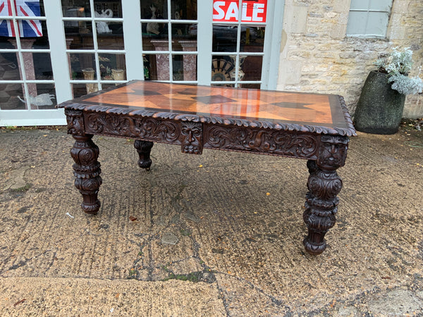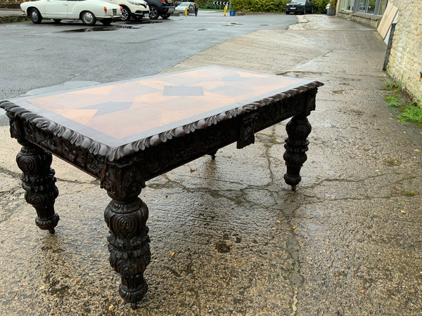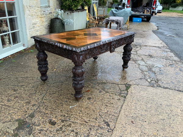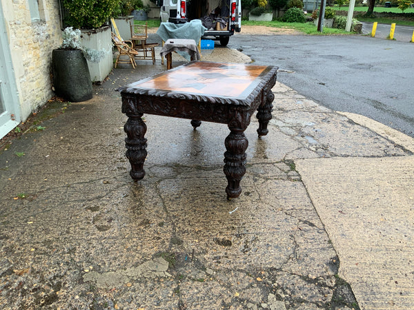 Very good quality unusual carved writing table. Being carved all the way around, with an unusual veneered geometrical top. Raised on carved legs with original brass and china castors. With two drawers.