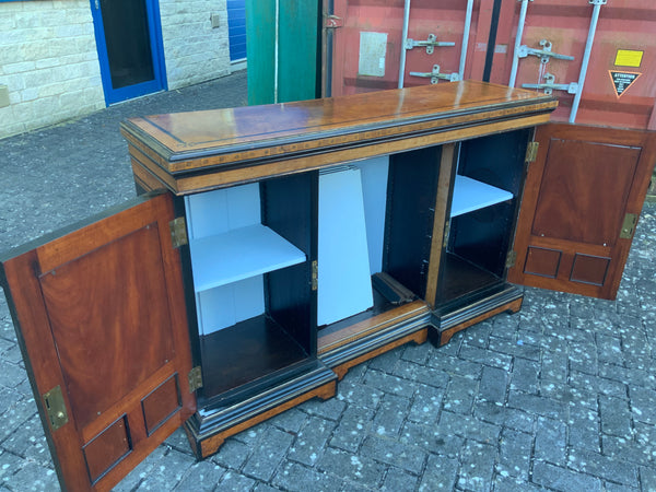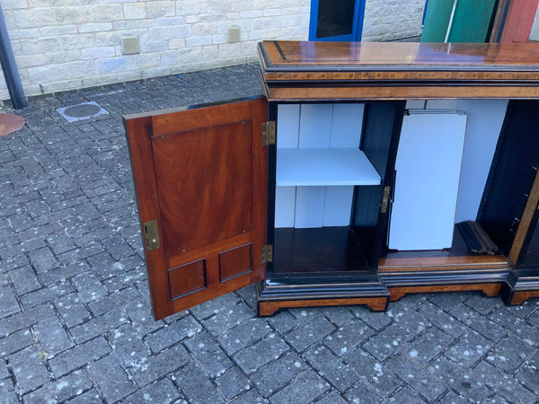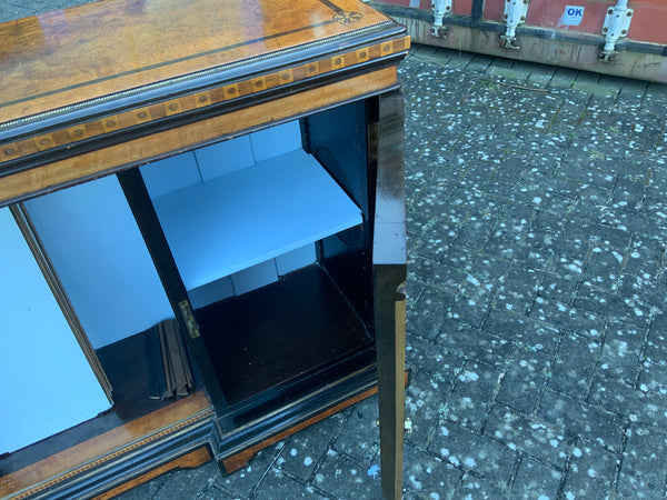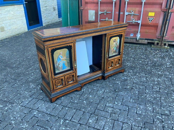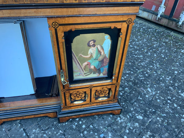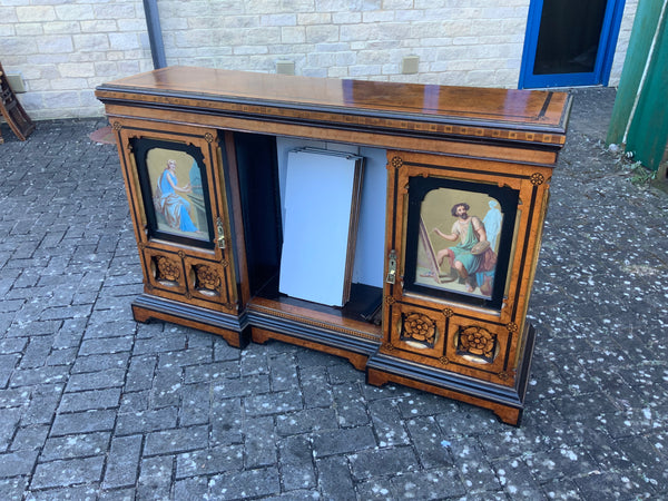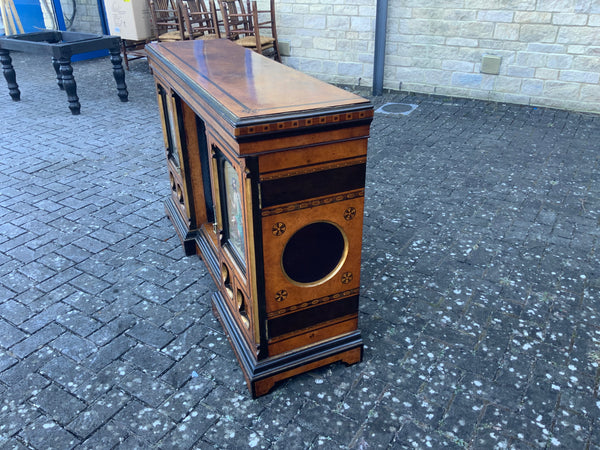 Very unusual good quality decorative walnut veneer sideboard, of the aesthetic movement. With inlaid decoration and painted panels. With two doors and shelves in the middle.