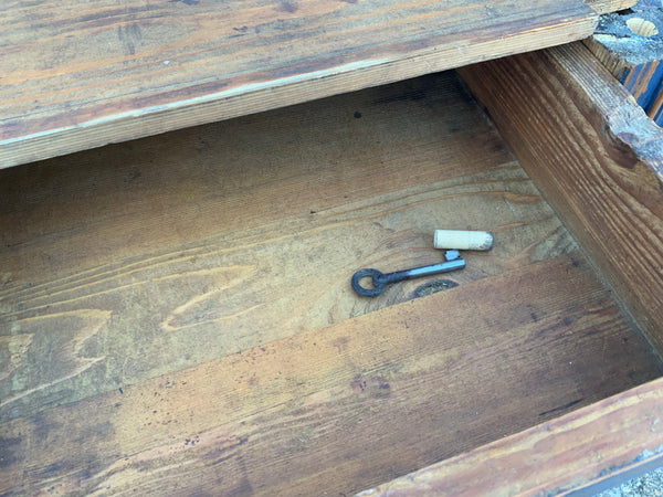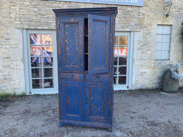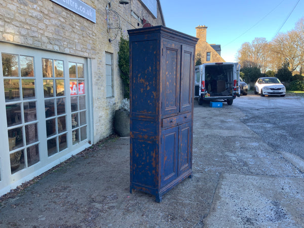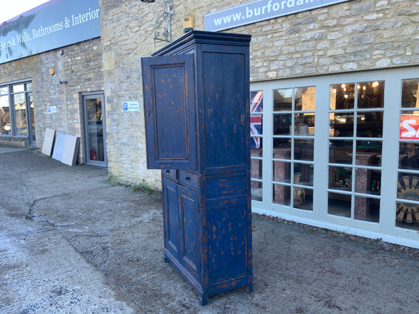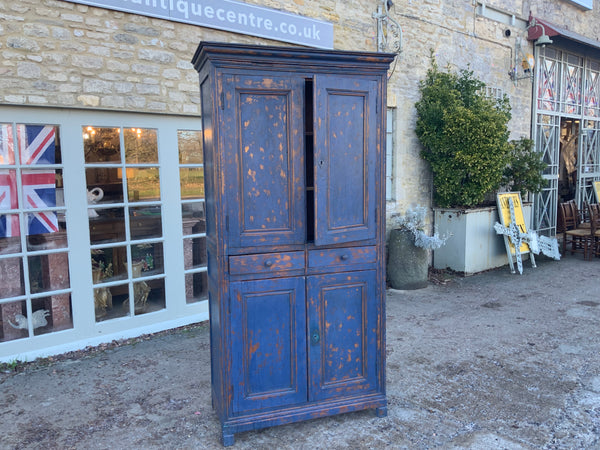 Narrow four door housekeeper cupboard, with two drawers in the middle. With original keys. It comes in two parts for ease of transportation. Later painted and distressed.