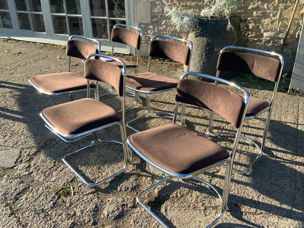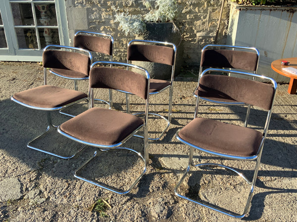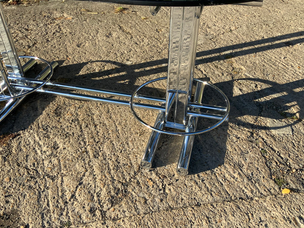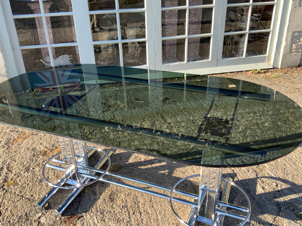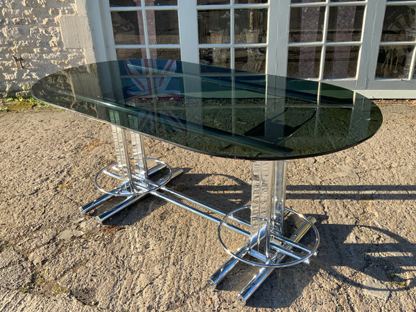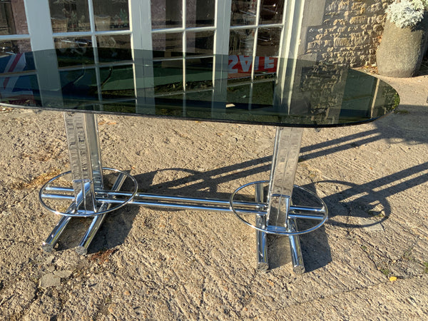 Stylish, smoked glass dining table with geometrical chrome base. With six matching chairs.