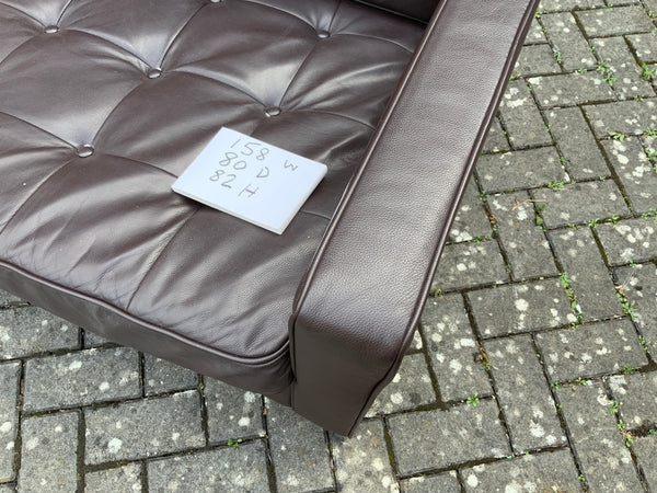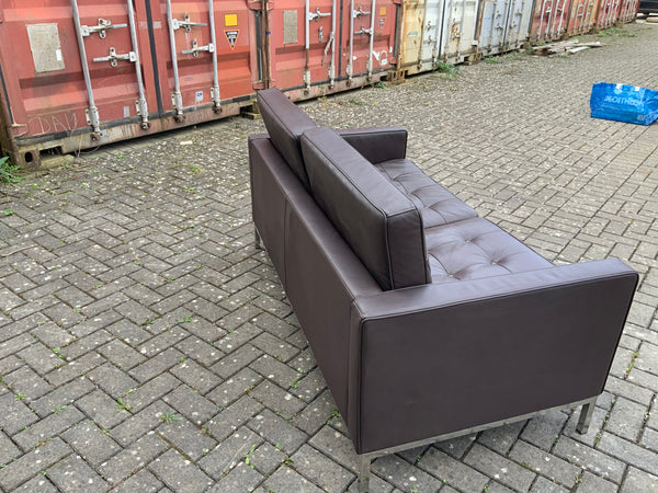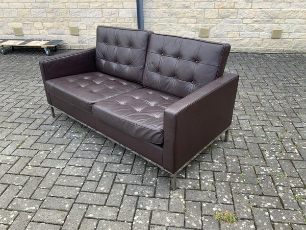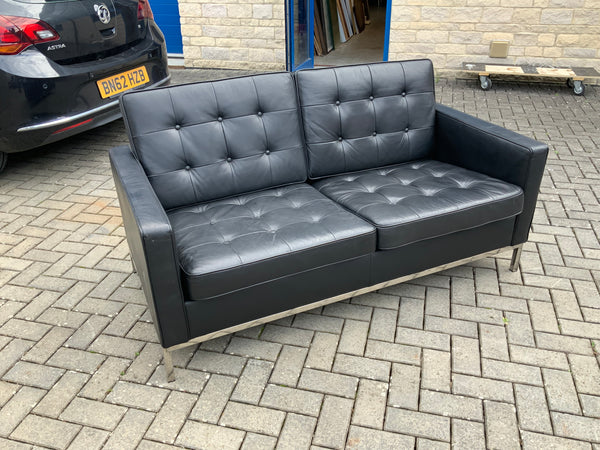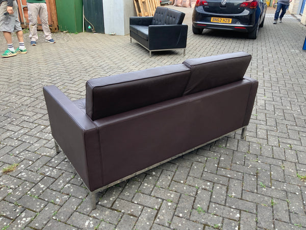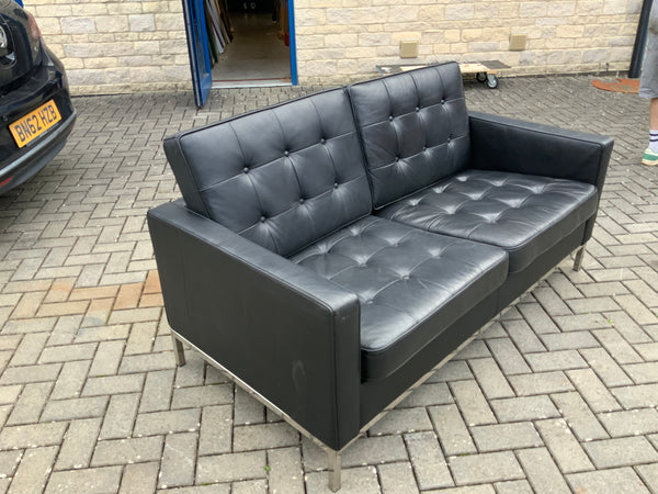 Two seater leather sofa with chrome legs. Button back and seat