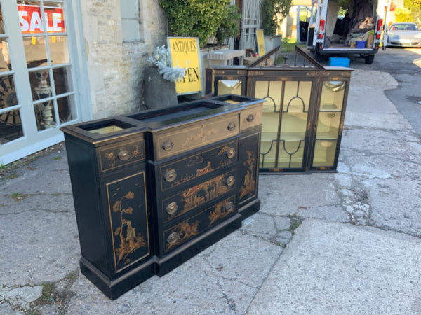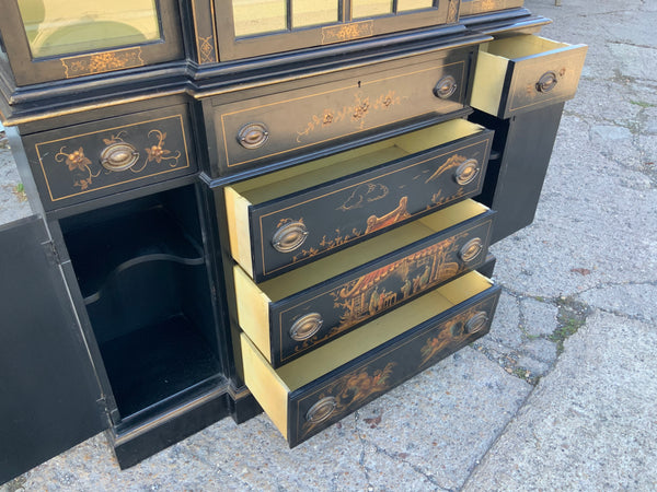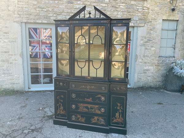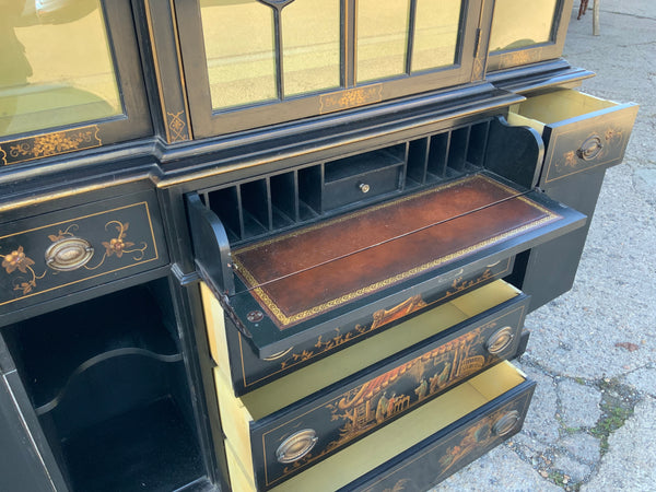 Very pretty vintage chinoiserie cabinet with three glass doors on the top and doors and drawers at the bottom. The first middle drawer has got a secretaire with leather insert.